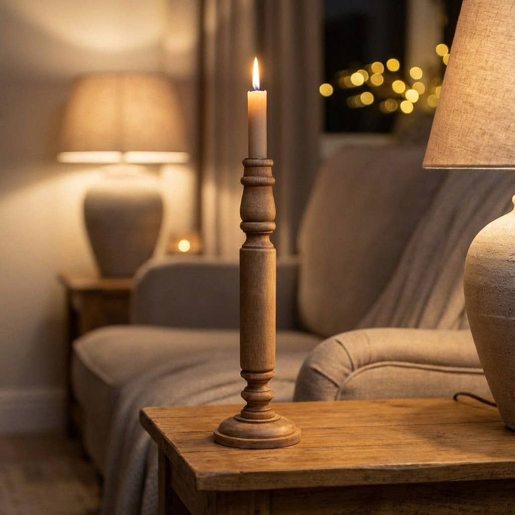 Ils sont disponibles en deux tailles, parfaits à associer ensemble pour créer une composition douce sur une table, une console ou une cheminée. La petite bague en métal à l’intérieur protège le bois de la chaleur et de la cire, ce qui les rend aussi pratiques que beaux.