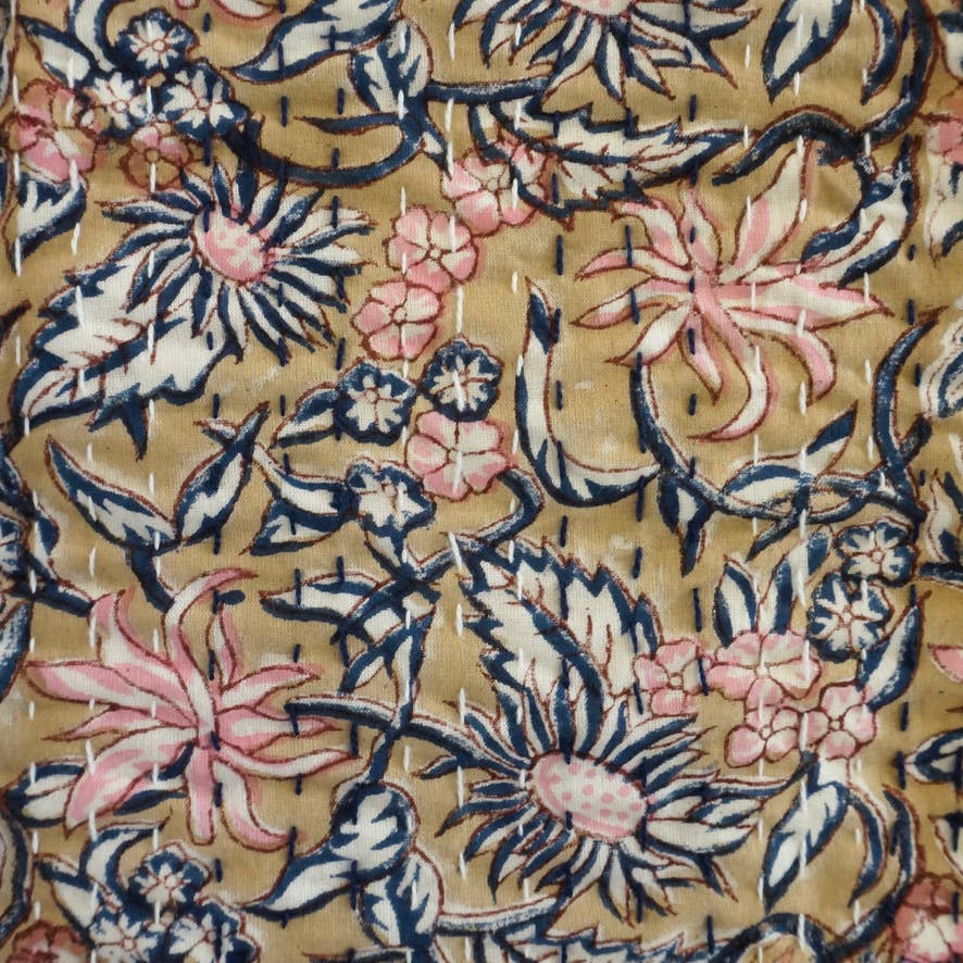 En Inde, les hommes impriment les tissus à l’aide de tampons de bois sculptés — la technique ancestrale du block print — puis les femmes assemblent chaque pièce à petits points, patiemment, pour créer ce matelassage si doux et irrégulier qui fait tout son charme.
